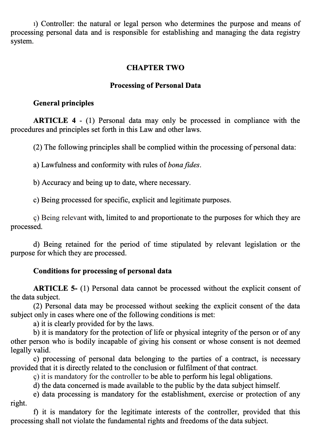 4 of the Personal Data Protection Law) and the rules of trust and integrity in the processing of the personal data. Within this scope, the