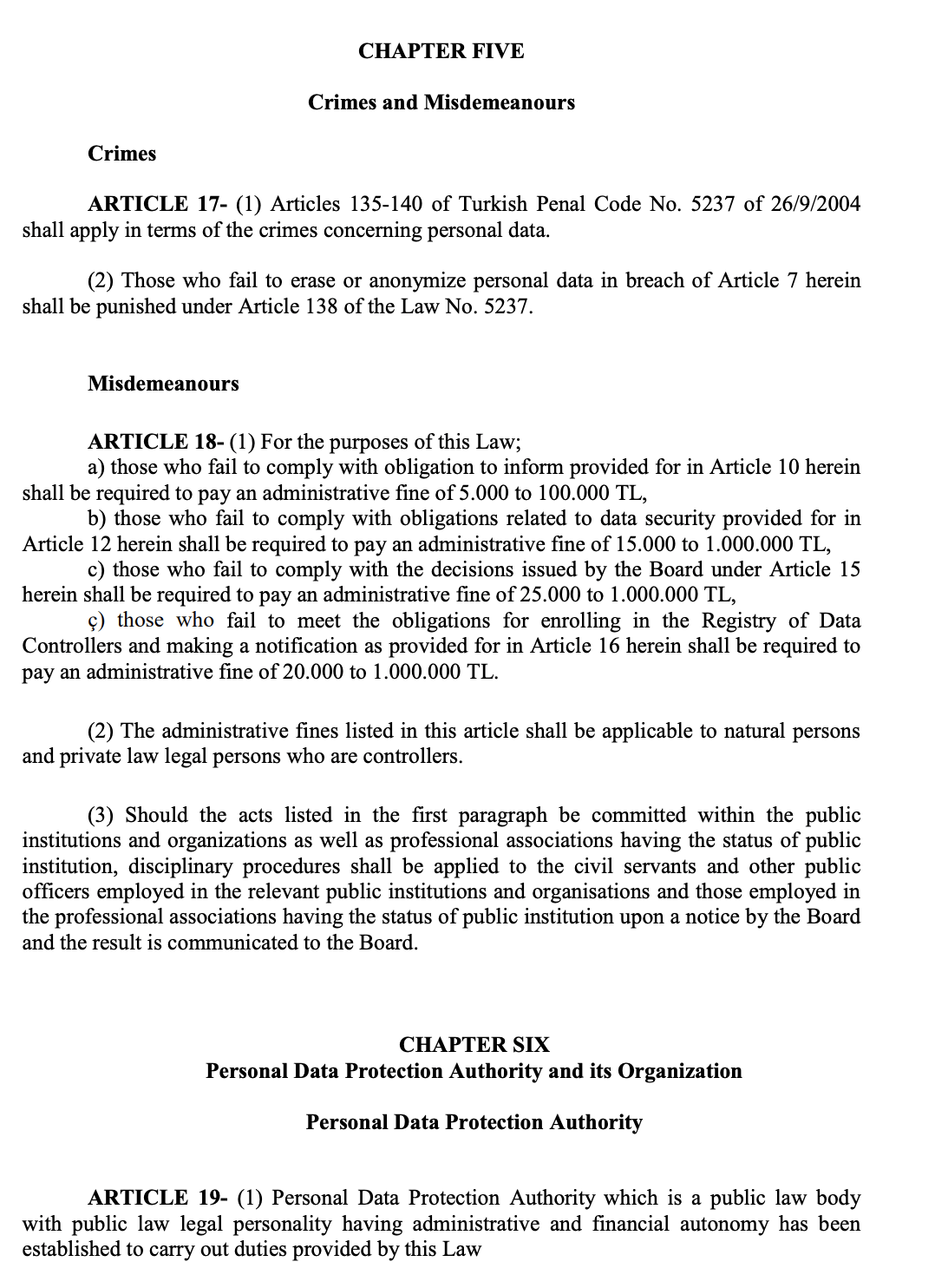 - 3.7.2. In the case that the personal data is processed and shared in contrary to the law and is not deleted when necessary, the procedures are carried out by the Legal Consultancy Department pursuant to the Articles 135 and 140 of the Turkish Criminal Law.